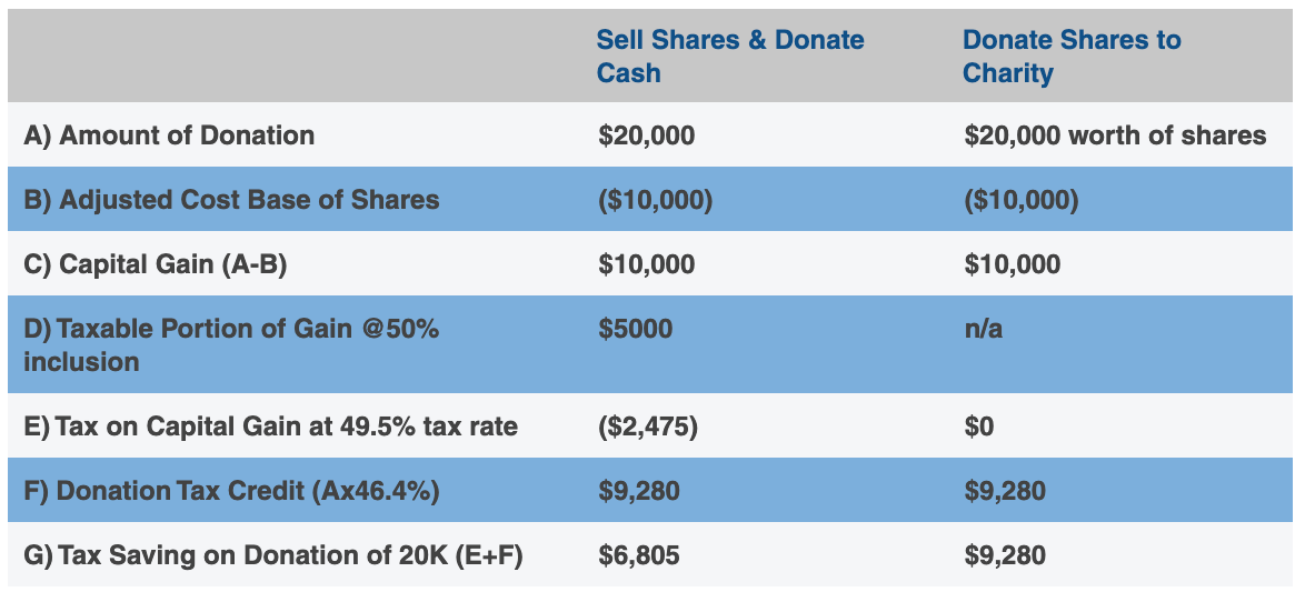 Therefore, when you donate the appreciated investment to a registered charity of your choice, the income inclusion rate is 0% since you do not have to include any capital gains. Had you sold the shares you would have to include 50% of the capital gains in your income